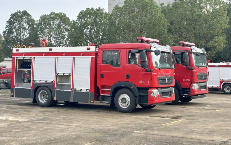 重汽豪沃8吨水罐泡沫消防车:采用国六底盘(ZZ5207TXFV471GF5),搭载MC7.34-60发动机(251Kw),罐体容积为6吨水+2吨泡沫,配备上海CB10/60消防泵和威斯特PL48W消防炮(射程≥60米水/55米泡沫),驾驶室为双排全金属封闭式。